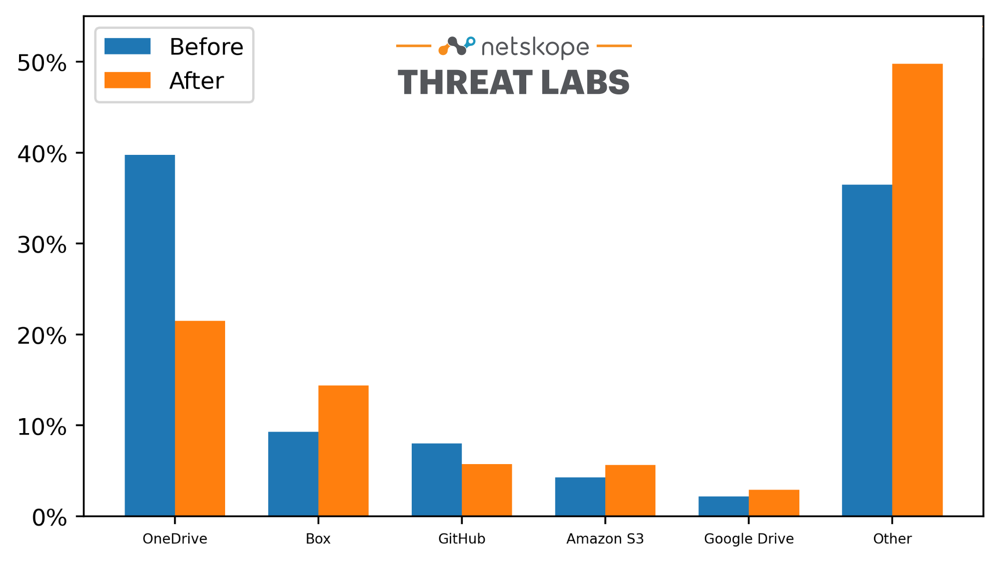 OneDriveの悪用は大幅に減少していること、Boxの悪用が増加していることは特徴的ですね。